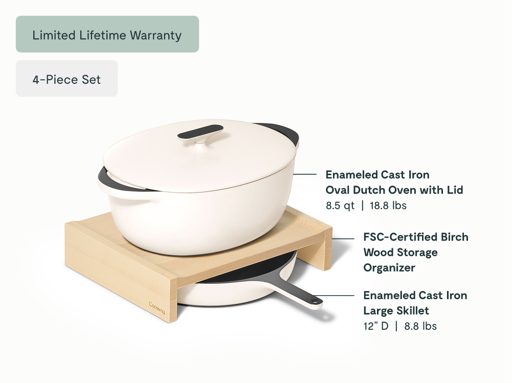 Make entertaining effortless with this dynamic and durable 4-piece set—featuring our 12” Enameled Cast Iron Large Skillet and 8.5 qt Enameled Cast Iron Oval Dutch Oven. Sized to fit your largest batches, these versatile pieces are up for any task, from one-pan recipes to an entire turkey. Designed with our 3-layer, non-toxic enamel coating for exceptional heat retention, even cooking, and effortless cleanup. Includes a complimentary Storage Organizer to keep your cookware and cabinets tidy and clutter-free.